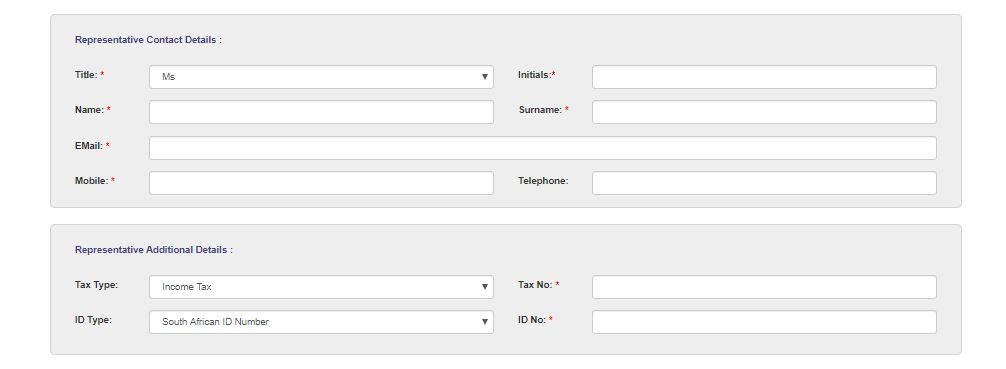 5. Capture the Representative Contact details (these are the details of the person that must be recorded as the Registered Representative of the taxpayer in the selected Capacity).