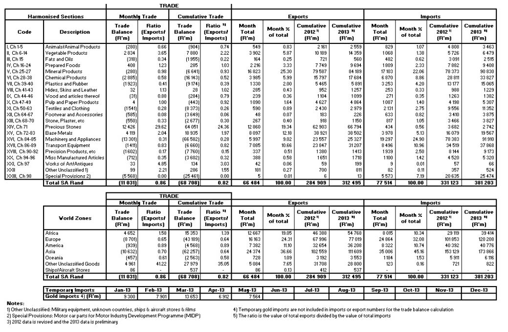 Africa: The surplus increased from R4.43 bn in April 2013 to R4.65 bn in May 2013. Exports increased by R0.69 bn to R12.67 bn and imports increased by R0.46 bn to R8.01 bn.